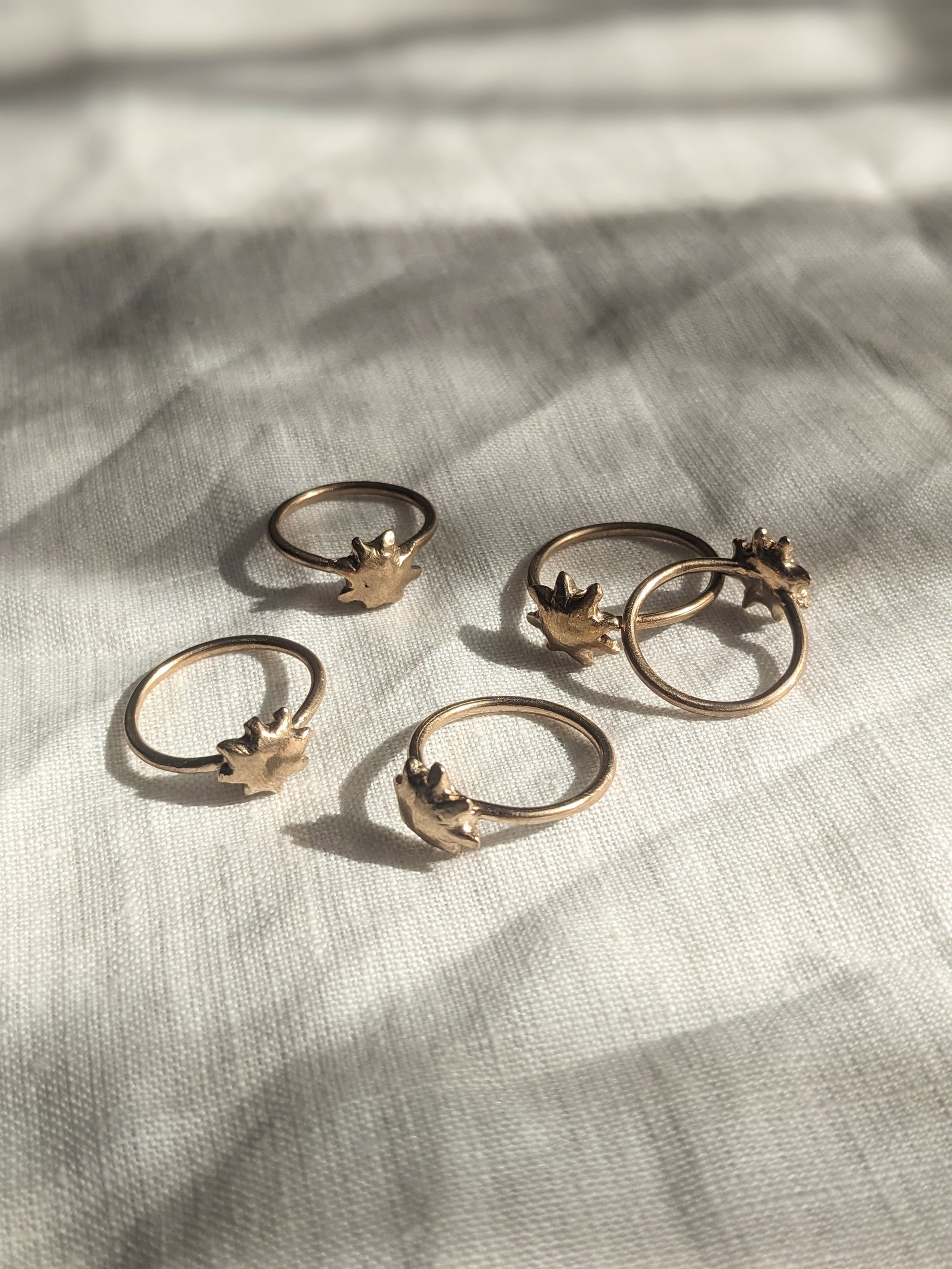 Rings are created from the ancient method of lost wax casting, individually carved from wax, then cast into metal and hand finished.
